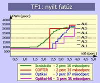 A 3. ábra a különböző észlelési elvű füstérzékelők válaszkarakterisztikáit mutatja a lángfázisú TF1 teszttűz esetén. A PW4 jelű függőleges tengelyen az egyes érzékelők válaszának értékei: minél nagyobb az érték, annál nagyobb a füstkoncentráció ill. a tűzveszély, hiszen kombinált érzékelők esetén az eszköz válasza nem feltétlenül a füstkoncentrációval arányos. Az ábrán a 2000-es értéknél meghúzott vonal átlépését tekintjük tűzjelzésnek. Az ábra jobb oldalán található AL1-AL6 értékek a kombinált érzékelők lehetséges jelzési lépcsőfokait, veszélyszintjeit mutatják. Az ionizációs érzékelő válasza tulajdonképpen a teszttűz során fellépő apró szemcseméretű, szabad szemmel nem látható füstrészecskék koncentrációjának időbeli változását mutatja. Az ábra azt bizonyítja, hogy a lángérzékeléssel javított optikai-hőérzékelő kombináció valóban versenyképes az ionizációs érzékelőkkel lángoló tüzek esetén. Az ábra kapcsán érdemes megjegyezni, hogy a kombinált érzékelők viszony kevés lépcsőfoka, jelzési szintje, egyben azt is jelenti, ezeknél az érzékelőknél egy igen nagyfokú jelzéskiértékelés, jelzésszűrés, döntés előkészítés folyik az érzékelőkben, míg a folytonos karakterisztikájú füstérzékelők esetén a döntés tulajdonképpen a központban valósul meg.